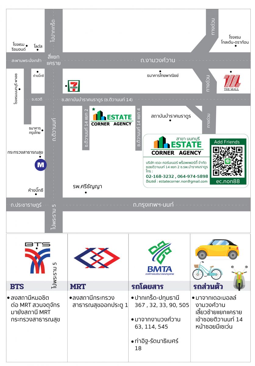 บริษัท เอสเตทคอร์นเนอร์ สำนักงานนนทบุรี เลขที่ 1 / 1 ซอย ติวานนท์ 14 แยก 2 (ซอยโรงพยาบาลบำราศนราดูร)