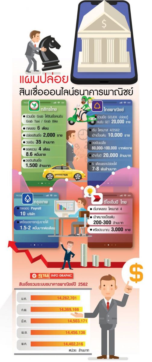 แบงก์แห่ปล่อยสินเชื่อออนไลน์ “กสิกรไทย-ไทยพาณิชย์”ตบเท้าจับกลุ่มคนขับ Grab-GETต่อยอดปล่อยกู้ มั่นใจข้อมูลเยอะ ช่วยลดความเสี่ยง ด้าน“กรุงเทพ” ขอทดลองเจาะกลุ่มเพย์โรล 10 บริษัท ดูผลตอบรับก่อนปล่อยจริง“ซีไอเอ็มบี ไทย” ลั่นไตรมาส 4 เดินหน้าปล่อยกู้คาดเบื้องต้น 200-300 ล้านบาท นายวีรวัฒน์ ปัณฑวังกูร รองกรรมการผู้จัดการอาวุโส ธนาคาร กสิกรไทย จำกัด (มหาชน) เปิดเผยว่า ทิศทางการปล่อยสินเชื่อออนไลน์หรือ Digital Lending ปีนี้ ธนาคารจะขยายลูกค้าไปสู่กลุ่มผู้ประกอบการธุรกิจขนาดเล็ก กลุ่มพ่อค้าแม่ค้ามากขึ้น หรือกลุ่มลูกค้า SME ที่เดินบัญชีกับธนาคารเพิ่มขึ้น นอกจากกลุ่มลูกค้าบุคคลที่ปล่อยสินเชื่ออยู่แล้ว เพราะต้องการขยายสินเชื่อไปสู่กลุ่มคนตัวเล็กที่ยังไม่ได้เข้าถึงสถาบันการเงินมากนัก โดยวงเงินปล่อยกู้เฉลี่ย 5 หมื่นบาทต่อราย อย่างไรก็ตาม หลังจากเริ่มทดลองปล่อยสินเชื่อออนไลน์ตั้งแต่ปีก่อน ธนาคารได้ปรับปรุงพัฒนาโมเดลธุรกิจและความเสี่ยงให้มีประสิทธิภาพอย่างต่อเนื่อง ซึ่งพบว่า สามารถลดเกณฑ์บางอย่างได้ดีขึ้น ส่วนหนึ่งเป็นผลจากข้อมูลที่มีมากขึ้น ถี่ขึ้น และวิเคราะห์ลูกค้าได้แม่นยำขึ้น ทำให้ลดเกณฑ์หรือข้อบังคับบางอย่างลงได้ เช่น รายได้ จากเดิมเคยปล่อยกลุ่มผู้ที่มีรายได้ตั้งแต่ 1.5 หมื่นบาทต่อเดือน ปัจจุบัน 7,500 บาทต่อเดือนก็สามารถขอวงเงินสินเชื่อออนไลน์ได้