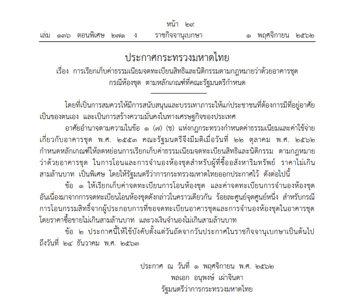 อาศัยอำนาจตามความในข้อ ๑ (๗) (ช) แห่งกฎกระทรวงกำหนดค่าธรรมเนียมและค่าใช้จ่ายเกี่ยวกับอาคารชุด พ.ศ. ๒๕๕๓ คณะรัฐมนตรีจึงมีมติเมื่อวันที่ ๒๒ ตุลาคม พ.ศ. ๒๕๖๒ กำหนดหลักเกณฑ์ให้ลดหย่อนการเรียกเก็บค่าธรรมเนียมจดทะเบียนสิทธิและนิติกรรม ตามกฎหมายว่าด้วยอาคารชุด ในการโอนและการจำนองห้องชุดสำหรับผู้ที่ซื้ออสังหาริมทรัพย์ ราคาไม่เกินสามล้านบาท เป็นพิเศษ โดยให้รัฐมนตรีว่าการกระทรวงมหาดไทยออกประกาศไว้ ดังต่อไปนี้