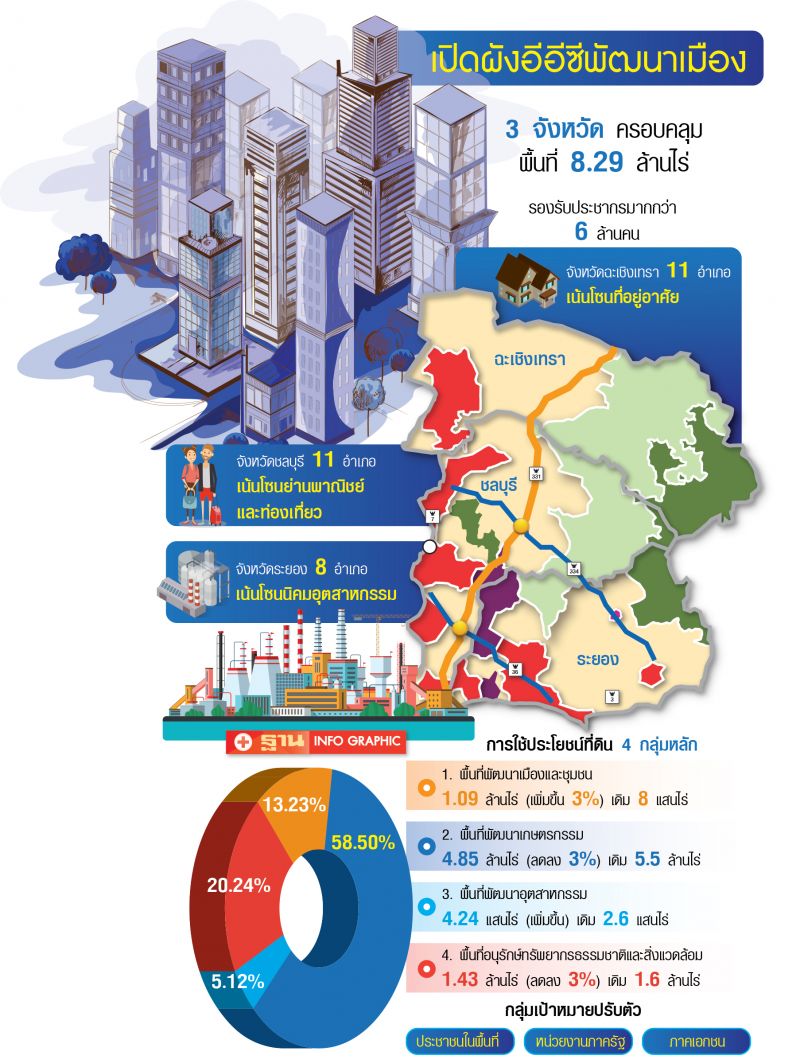 การเกิดขึ้นของโครงการพัฒนาระเบียงเศรษฐกิจพิเศษภาคตะวันออก(อีอีซี) ต่อเนื่องโครงการพัฒนาพื้นที่บริเวณชายฝั่งทะเลตะวันออก หรืออีสเทิร์นซีบอร์ดของรัฐบาลในอดีต ตามเป้าหมาย เพื่อสร้างความเชื่อมโยงกับจังหวัดอื่นๆ ในประเทศ ตลอดจนความเชื่อมโยงในระดับภูมิภาค โดยวางยุทธศาสตร์ให้ 3 จังหวัด คือ ระยอง ชลบุรี และฉะเชิงเทรา เป็นประตูเศรษฐกิจสำคัญของประเทศ ทั้งด้านการ ผลิตสินค้า การขนส่ง การลงทุน การท่องเที่ยว เชื่อมโยงอาเซียน จีน และอินเดียนั้น นำมาซึ่งการจัดทำแผนผังเมืองเฉพาะ อีอีซี เพื่อให้การพัฒนาพื้นที่มีกรอบดำเนินการ สอดคล้องกับยุทธศาสตร์ของโครงการอย่างแท้จริง