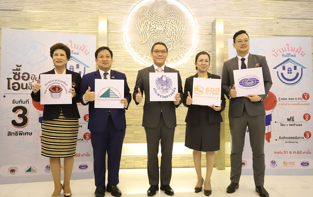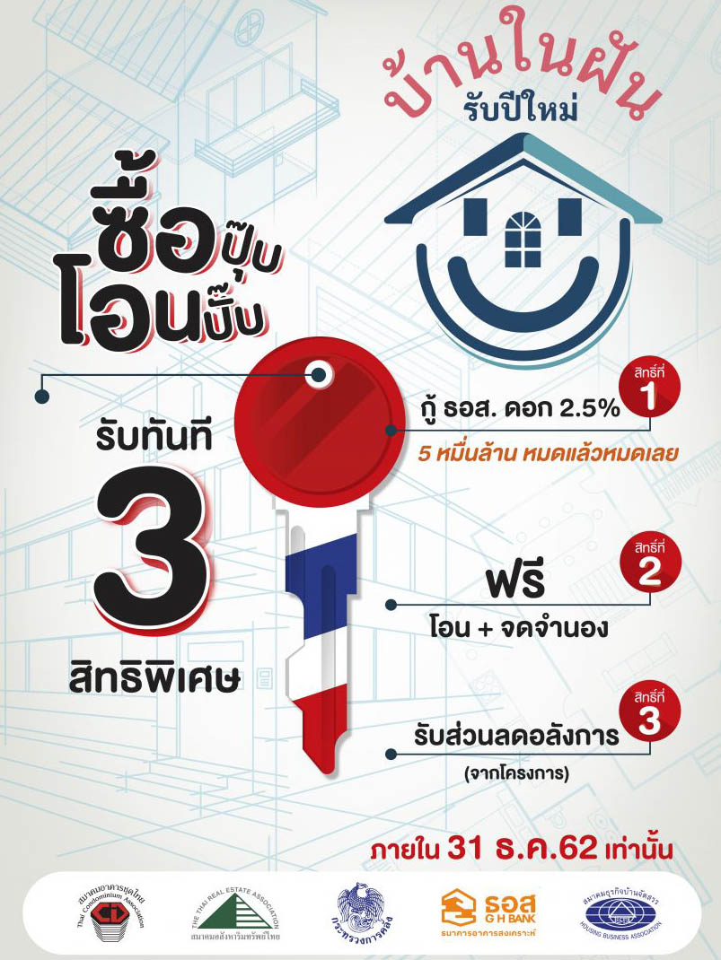 นายชาญกฤช เดชวิทักษ์ ผู้ช่วยรัฐมนตรีประจำนายกรัฐมนตรี (ปฎิบัติงานกระทรวงการคลัง) เปิดเผยว่า กระทรวงการคลังขอความร่วมมือธนาคารอาคารสงเคราะห์ (ธอส.) ผู้บริหาร 3 สมาคมอสังหาฯ ประกอบด้วย สมาคมอสังหาริมทรัพย์ไทย สมาคมอาคารชุดไทย สมาคมบ้านจัดสรร รวมทั้งผู้ประกอบการอสังหาฯ รายย่อย ร่วมสานฝันของพี่น้องประชาชนคนไทย เพื่อให้พี่น้องประชาชนมีที่อยู่อาศัยเป็นของตัวเอง โดยได้ผนึกกำลังเพื่อจัดทำโครงการ “บ้านในฝัน รับปีใหม่“ ด้วยการออกโปรโมชั่นยิ่งใหญ่สุดอลังการส่งท้ายปี 2562 ชนิดไม่เคยมีมาก่อน โดยใช้สโลแกน “ซื้อปุ๊บ โอนปั๊บ รับทันที 3 สิทธิพิเศษ” สิทธิ์ที่ 1. กู้ ธอส. ดอกเบี้ยคงที่ 2.5% นาน 3 ปี วงเงิน 5 หมื่นล้านบาท หมดแล้วหมดเลย สิทธิ์ที่ 2. ฟรีทันที ค่าโอนและค่าจดจำนอง และสิทธิ์ที่ 3. รับโปรโมขั่น ลดแลกแจกแถม พร้อมส่วนลดพิเศษสุดอลังการจากโครงการอสังหาริมทรัพย์ที่เข้าร่วม ทั้งบ้านเดี่ยว บ้านแฝด ทาวน์โฮม อาคารพาณิชย์ และคอนโดมิเนียม ทั้งนี้กำหนดให้เฉพาะที่อยู่อาศัยวงเงินไม่เกิน 3 ล้านบาท
